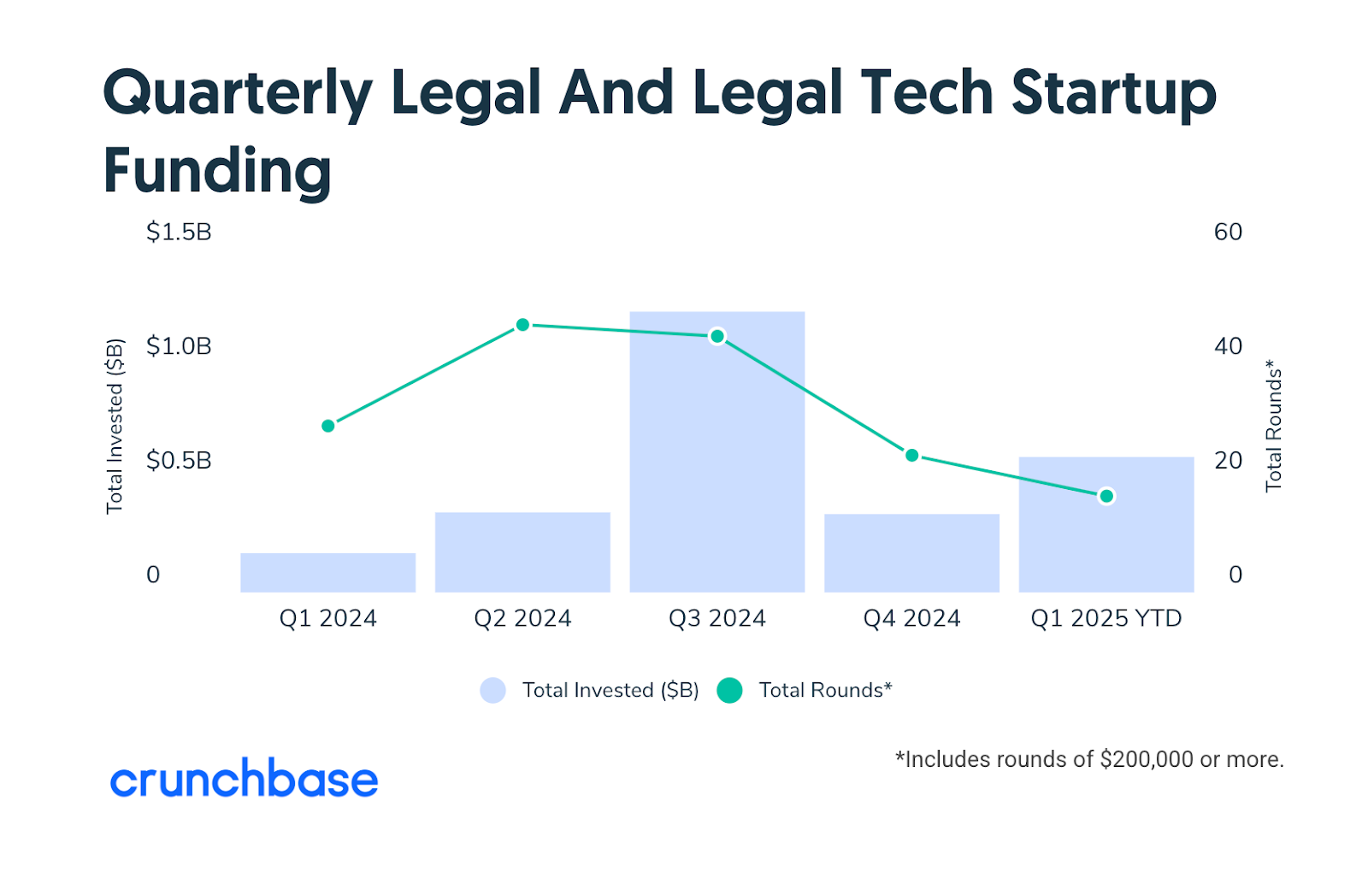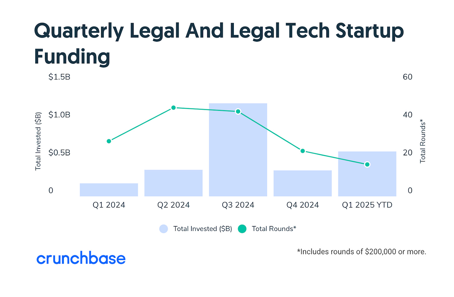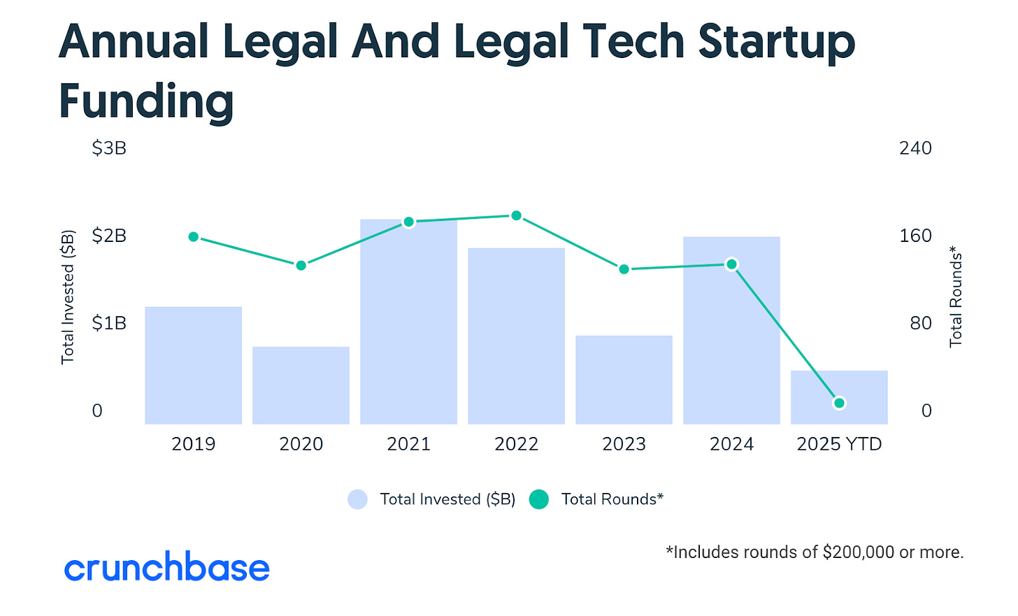 Legal tech companies have already garnered $600 million in funding so far this year, nearly double what the sector received in Q4 of 2024. Last year’s total of $2.15 billion was just shy of the $2.35 billion raised in 2021, but topped both 2022 and 2023.