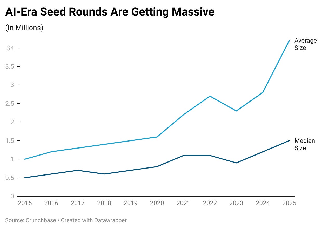 We’ve gotten to a place where megasized seed rounds come across regularly and we don’t bat an eye. Fei-Fei Li’s company World Labs launched in 2024 with $230 million in initial funding. Ilya Sutskever’s Safe Super Intelligence raised $1 billion in funding out of the gate in 2024. And Mira Murati’s Thinking Machines launched with a $2 billion seed round. Last month, another AI research lab started by former Anthropic, xAI, and Google engineers, called humans&, launched with $480 million in funding at a $4.48 billion valuation and a writeup from The New York Times.