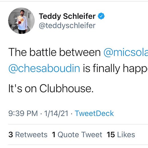 A couple quick takes: one, it’s a simple story of hubris. Solana and Asparouhov are so cocky on Twitter and tech generally has such a condescending view of politicians, to see them humbled a little bit was gratifying. I respect that neither had time to prepare for this epic moment. But if they’re so solidly against him, I would have hoped they could have articulated a better case. Two, it’s interesting to see all the self-interested thinking on Twitter reacting to the conversation. I have no idea whether Boudin is the best person for the DA job. It’s a case where I truly don’t have a political point of view. But to watch people reinterpret Boudin’s performance as a failure seemed to demonstrate how much we view political discussions based on which side we’re rooting for. Three, the whole incident made me excited about audio! On Twitter, antagonists don’t have to listen to their critics. Their failure to respond to critics shows their high status, not their inability to defend their positions. On Clubhouse, where the line goes silent if you don’t reply, you’re forced to actually have a thoughtful response or reveal that you don’t have one. Still, Twitter played a big role in distributing the Clubhouse conversation. Many people seemed to consume it through tweets.