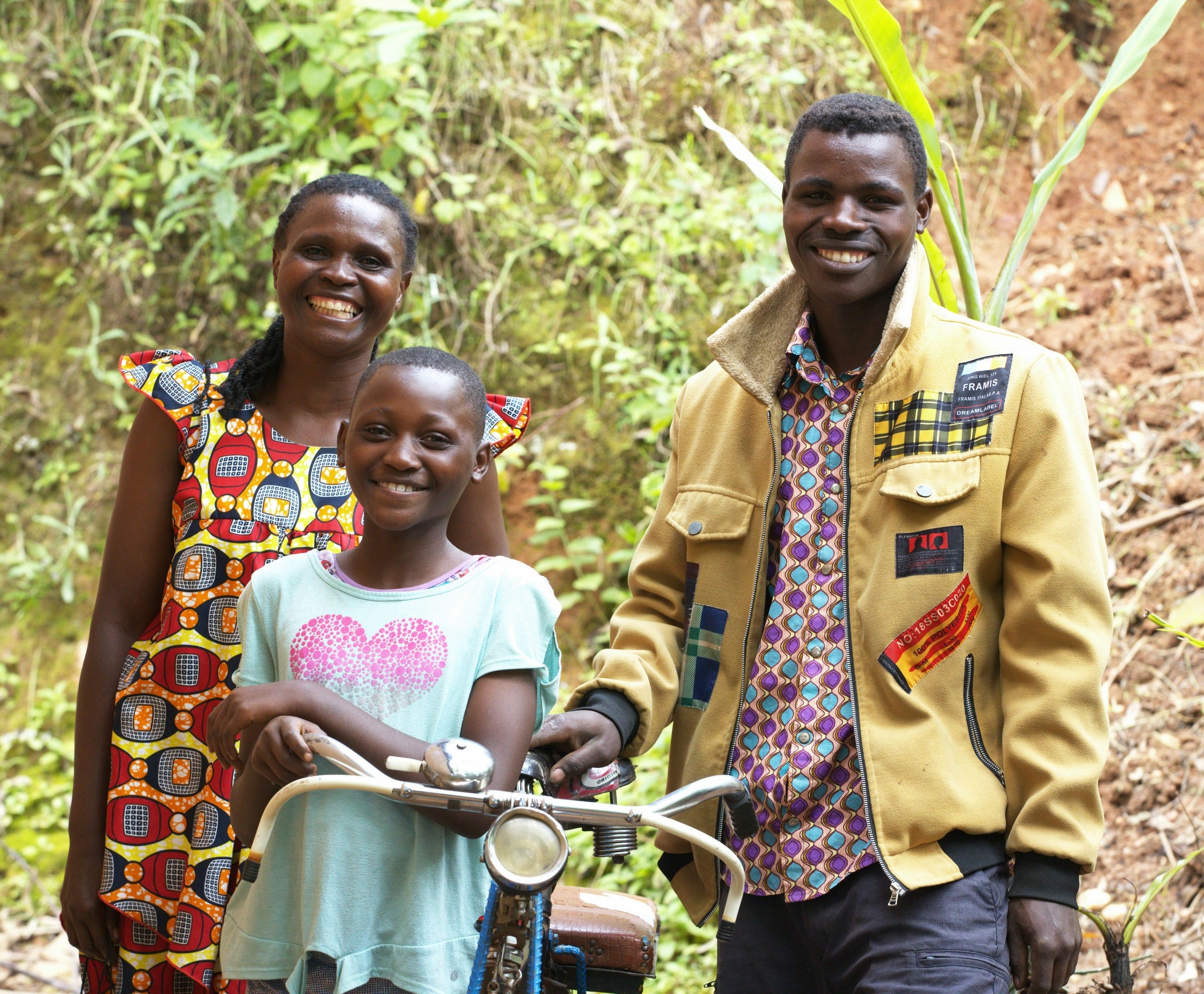 Alphonsine, pictured above with her two sons, had only irregular farming work after separating from her husband and struggled to care for her children. With $1,100 she was able to buy a small plot of land for farming, as well as three pigs, household items, and a bicycle for her eldest, 23-year-old Melchiade, who now has transport to support himself.