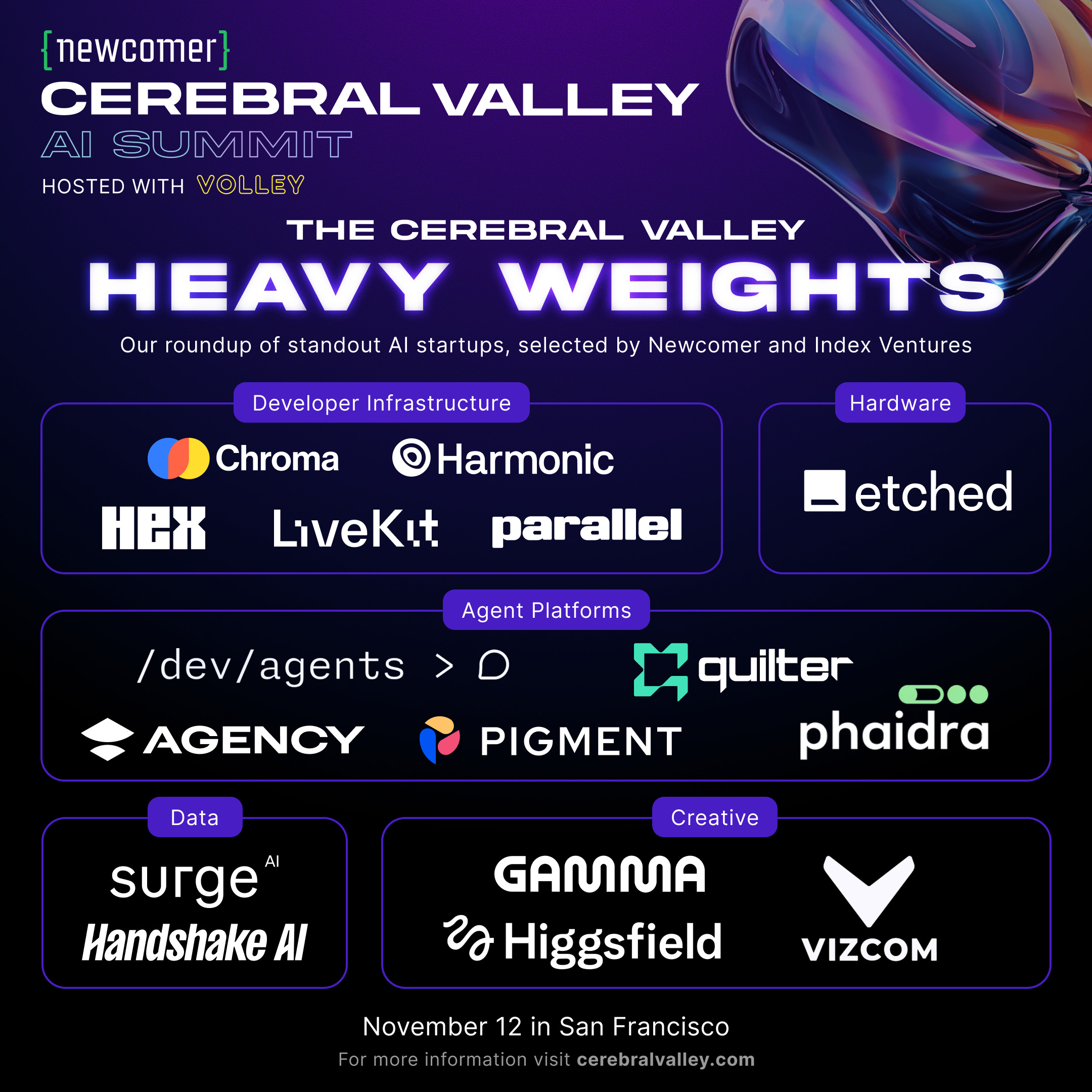 We looked at the people who have been attending our summits and some of the best founders we’ve been connected with over the last year. We were looking for the same things that all the VCs are looking for — an exciting product, talented founders, AI-fueled momentum — and put together a list (albeit without the rigorous financial analysis investors are doing behind the scenes). And we consulted with Index, who is sponsoring the summit, to make sure we were bringing together a great group of startups.