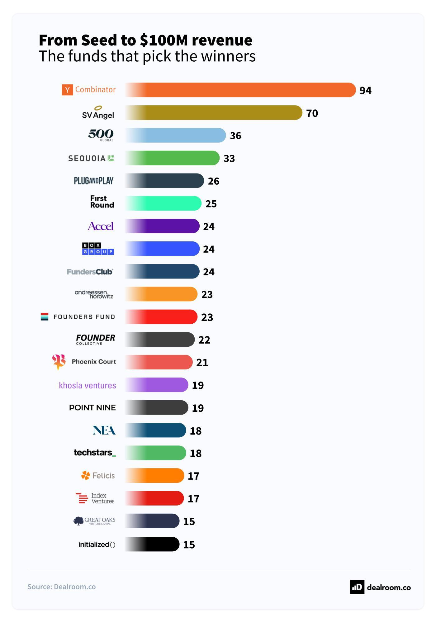 Dealroom published a list of funds that have written the most seed-stage checks to startups that eventually reached $100 million in revenue, and it’s little surprise that the storied startup accelerator Y Combinator came out on top with 94 companies so far. The accelerator backs around 500 to 600 startups a year nowadays.