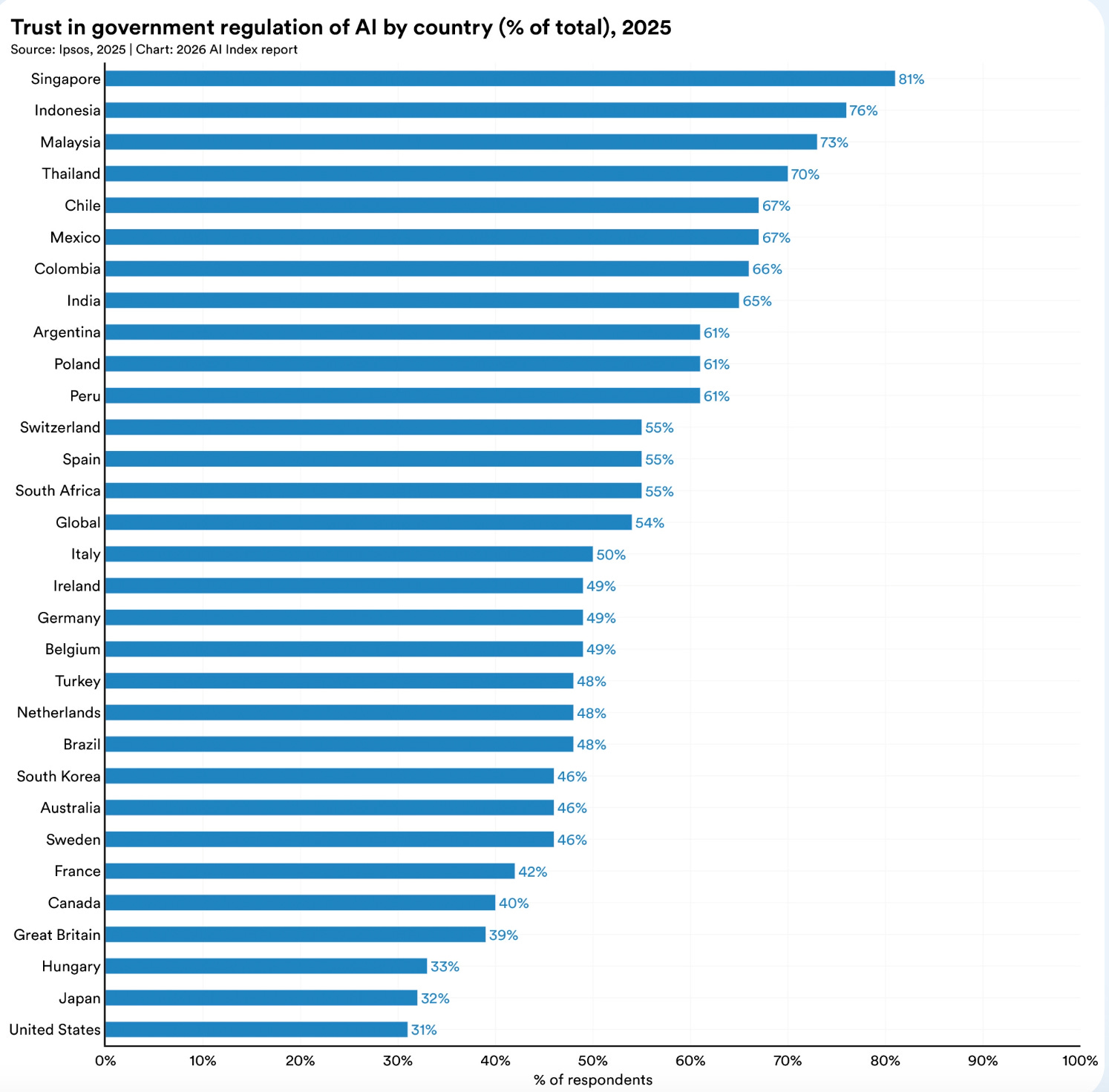 The US also showed the lowest trust in its own government’s ability to regulate AI, with only 31% of respondents feeling confident about it.