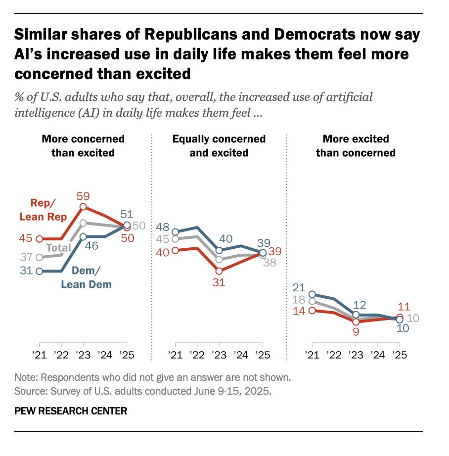 There is a strong appetite for AI regulation. The demand for oversight is broad and bipartisan, although Democrats are increasingly concerned about AI while Republicans are trending slightly towards less concern, per Pew Research polling from 2020 to 2025.