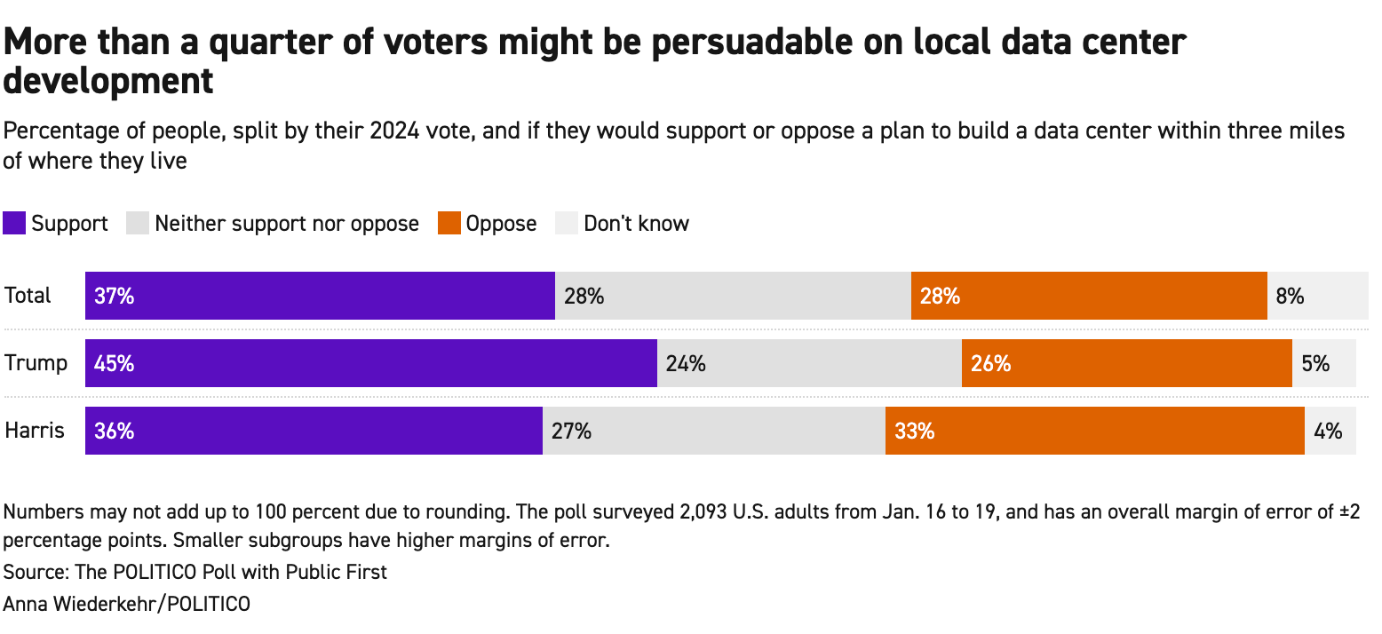 Polling around data centers is fuzzier, but Politico’s February survey found that a majority of American voters are undecided or are slightly positive about data centers coming to their communities.
