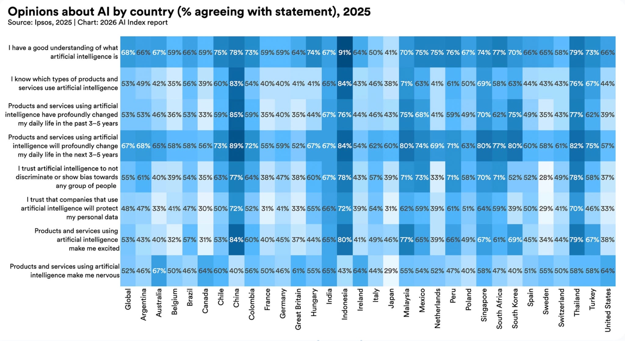 Stanford AI Index, April 2026: US Sentiment on AI Is Much More Negative Than in Most Other Countries